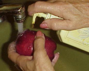 One caution we would make with the safety of eating an apple without cleaning it properly.  Apples are washed in a recycled cleaning operation and we have observed where the water tanks are not refreshed on a regular basis.  The cleaning operation is primarily to remove pesticide residues. The apples after they are washed are encapsulated in a wax coating to make them look pretty and preserve them somewhat.   This can be a very unsafe procedure. This wax is not removed easily with just a rinsing under the faucet. We have found that liquid dish soap does cut the wax and takes care of the residue.  We would strongly recommend that you follow this cleaning process.  As described on the right/above we use the soap and use our hands to scrub the fruit,  although some may want to take it a step further and use a brush.   Caution do not wash fruits or vegetables in advance, wash them just before you use them.